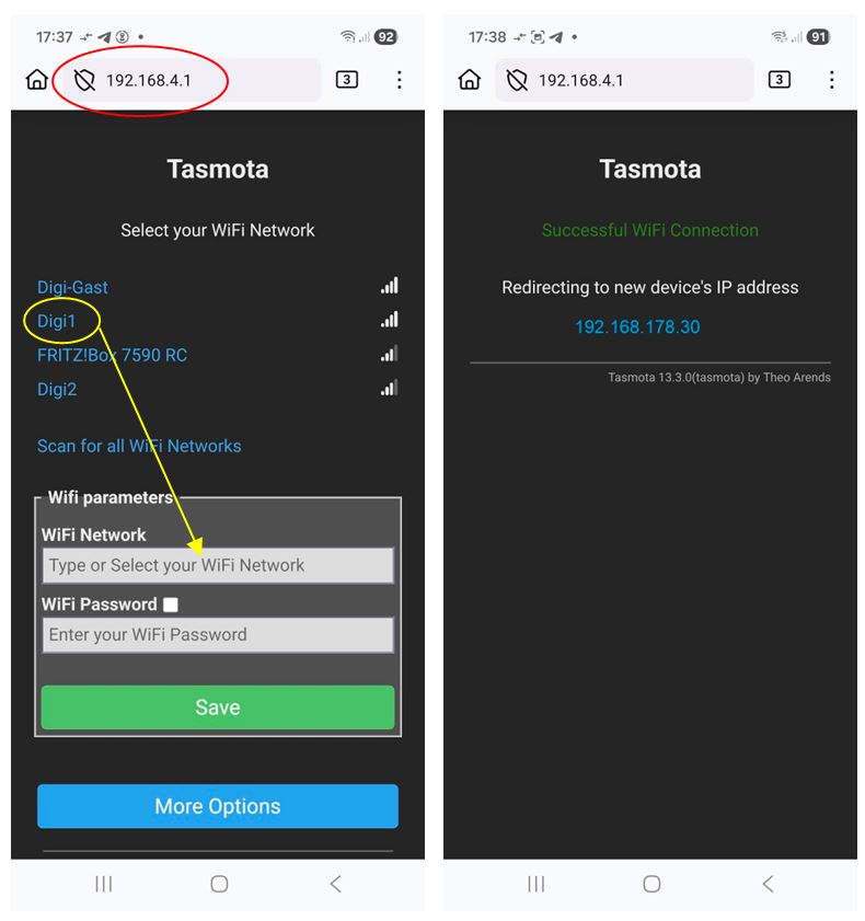 Nachdem z.B. mein Handy mit dem WLAN des Clients verbunden ist, kann ich in meinem Internetbrowser in die Adresszeile die IP des Clients eingeben. IdR. ist dies die 192.168.4.1/ .Nach bestätigung bin ich mit der Konfigurationsseite für die WLAN-Verbindung zum Hausrouter verbunden.